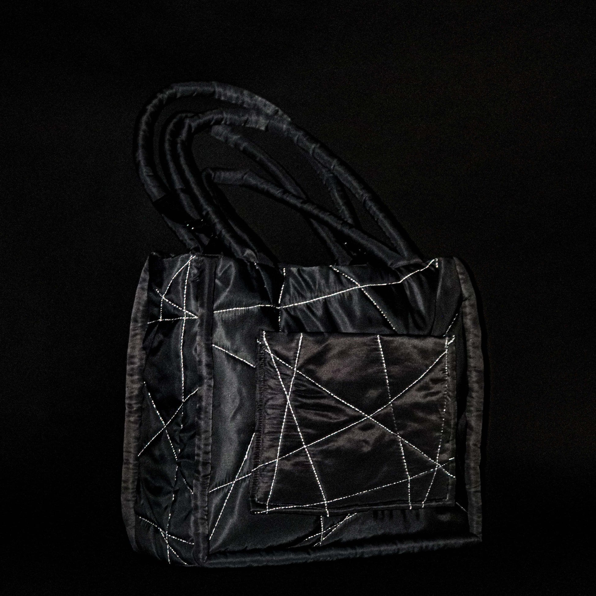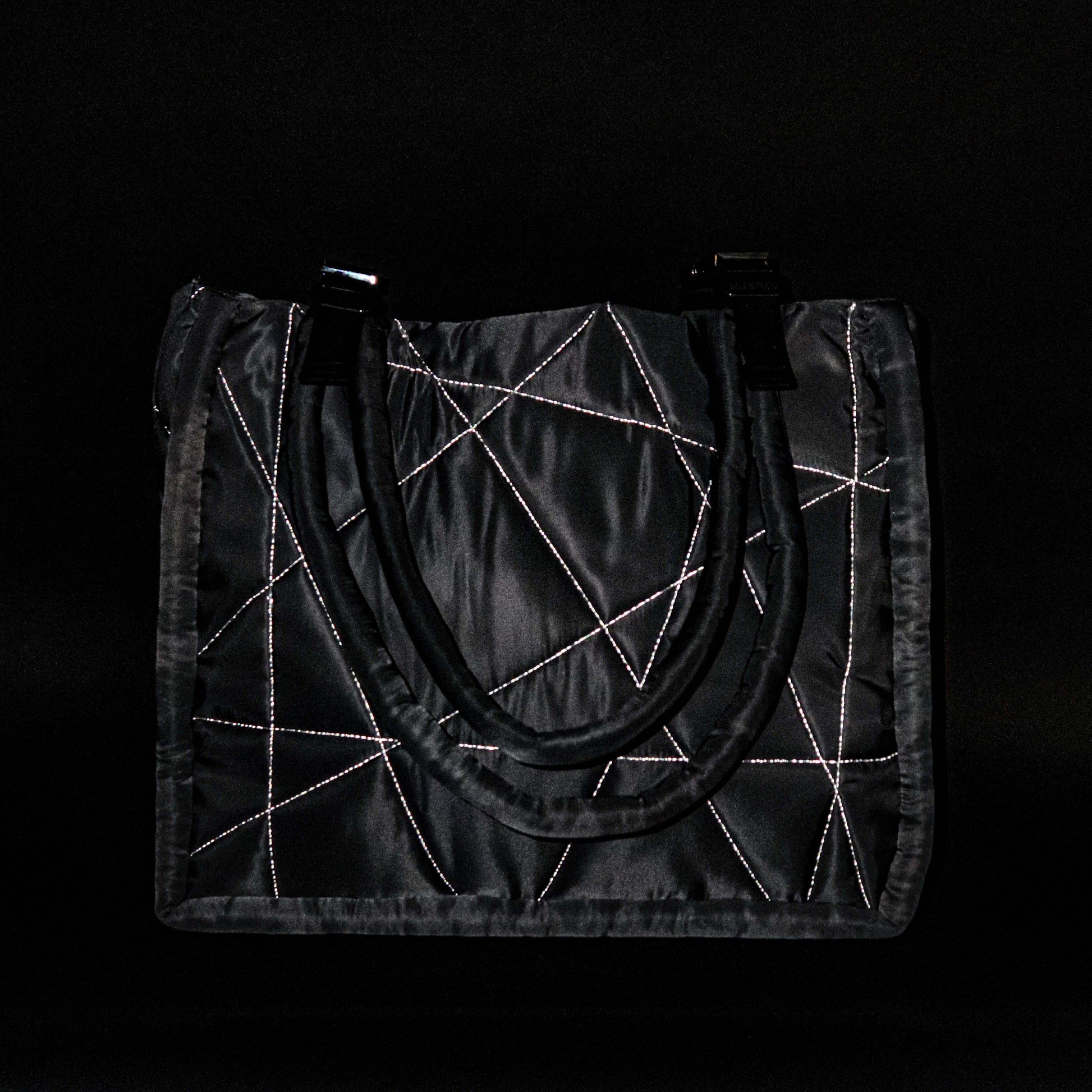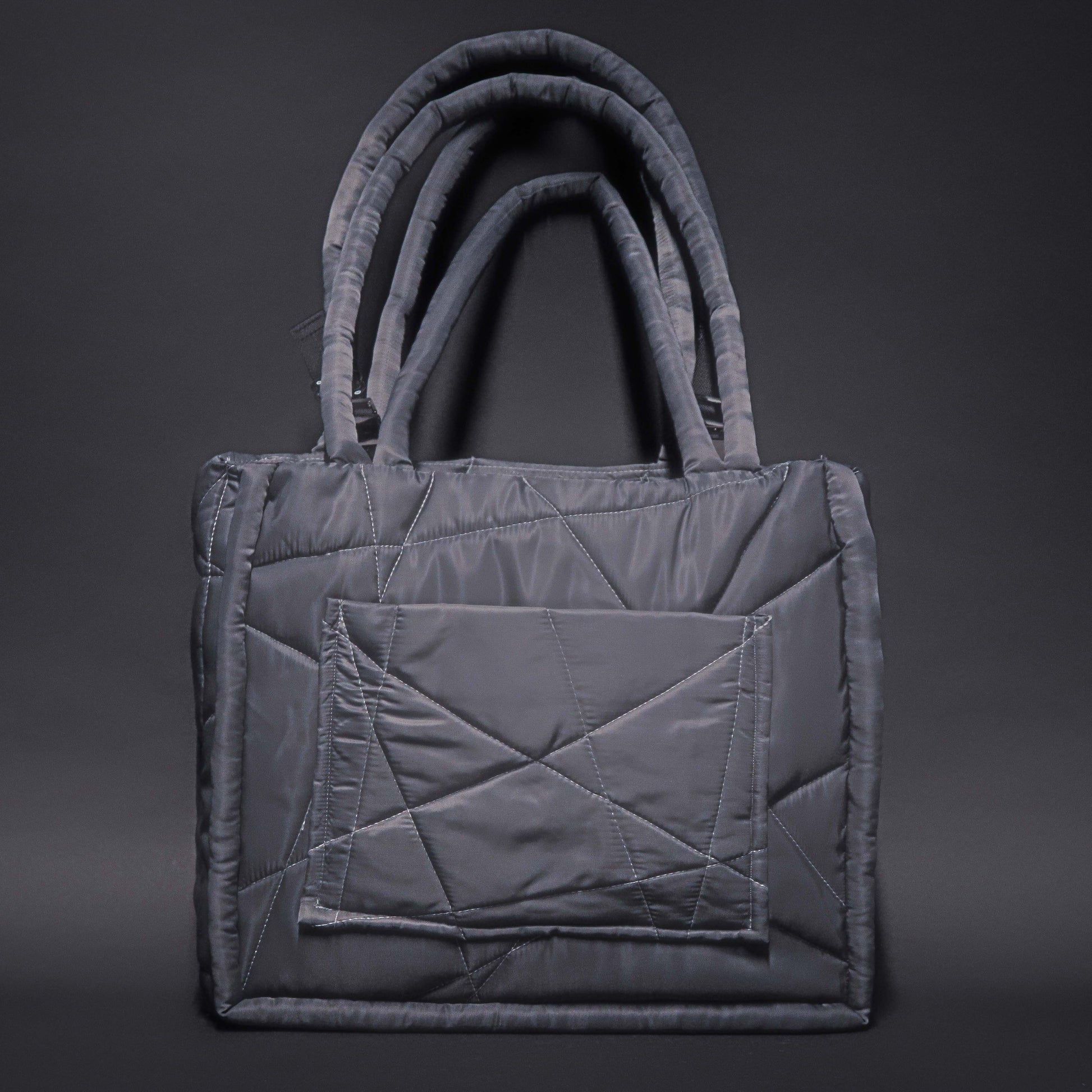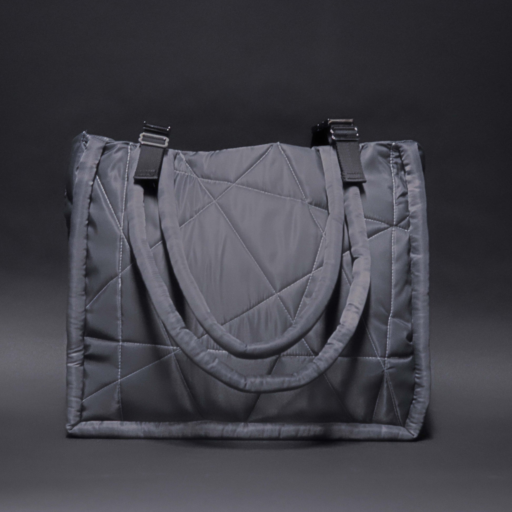 コレクションエディション - 耐水性の表地、吸湿発散性に優れた裏地、快適なパッド、反射ステッチのディテールが特徴のユーティリティパファートートバッグ。